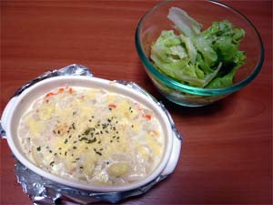 今日のご飯はご飯にホワイトシチューとチーズを掛けたものとサラダです